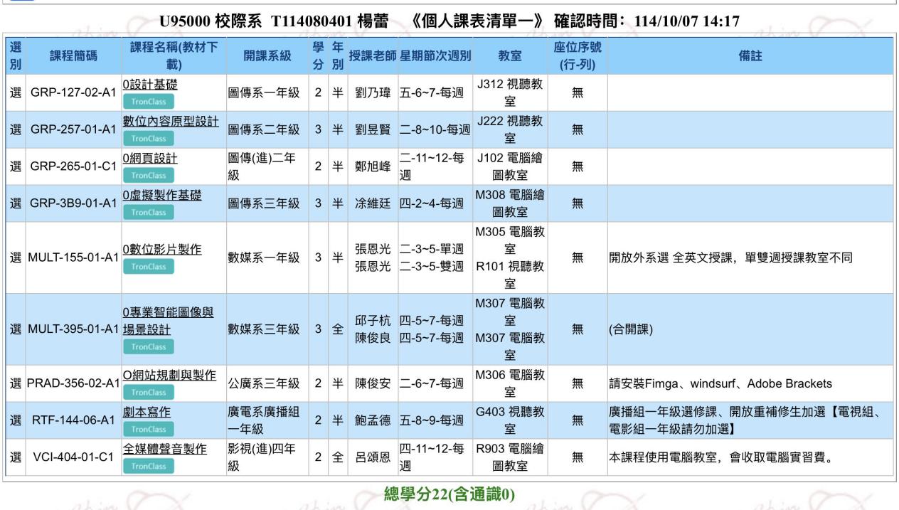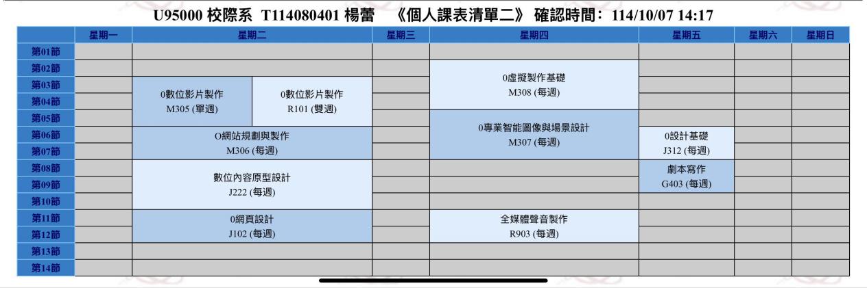 杨蕾同学在台湾世新大学学习期间课表