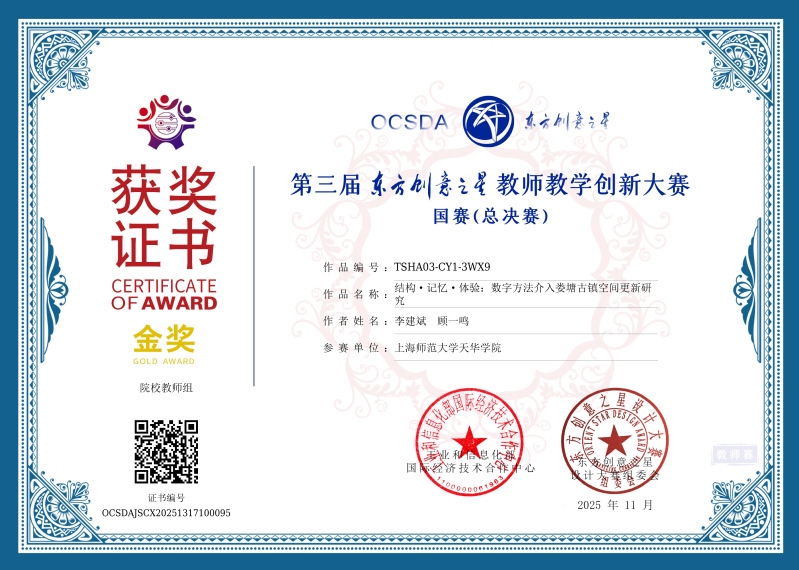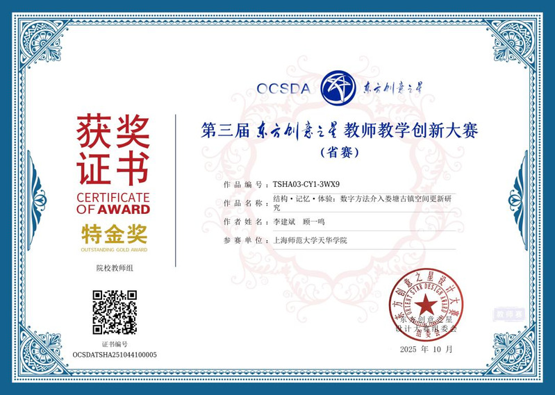 李建斌老师的获奖作品《结构·记忆·体验:数字方法介入娄塘古镇空间更新研究》,基于江南古镇的空间与文化,运用数字方法对娄塘古镇进行系统更新设计。作品探索了数字技术与地方文化结合的空间更新路径,联结历史保护、旅游体验和社区生活,提供了可推广的教学与实践范式。在国赛答辩中,李建斌老师受邀参加教师教学创新论文工作坊,分享将竞赛成果、实践与课程改革转化为教学论文的经验。