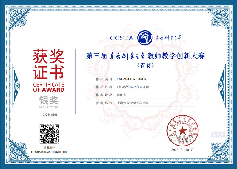 教师 韩丽莹 凭课程作品 《〈景观设计〉混合式课程》 荣获省赛银奖;教师 秦屹 以作品 《负都市》 荣获省赛银奖。