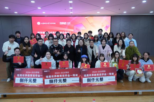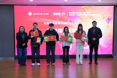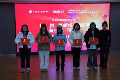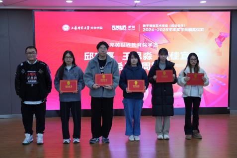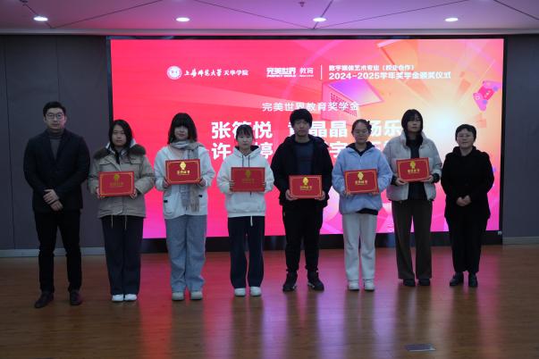随后,数字媒体艺术(校企合作)专业主任黄潇馨宣读奖学金评选标准。由艺术设计学院常务副院长朱花、完美世界教育副总裁陈阳、艺术设计学院党总支书记王慧荣、完美世界教育京沪区院校合作负责人左成季龙、完美世界教育资深专业教师陈磊、冯一露为获奖同学颁发奖状和奖品。在颁发企业项目优秀个人奖前,仪式播放了2025年项目实践精彩回顾瞬间,由2025年赛事组织的精彩瞬间和视频剪辑与特效课程优秀作品组成。本届奖学金包括张紫辰、瞿依婷、瞿晶雯等共计二十八