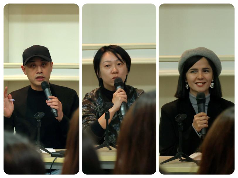 王向韬、时坤、爱丽(从左至右)在会上分享创作心得