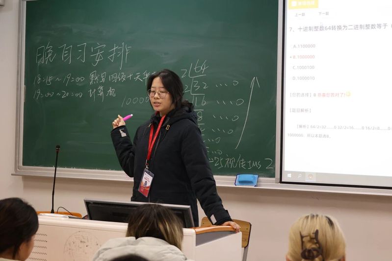 班助理严格执机房考勤制度,提前到岗清点⼈数,精准记录迟到、缺勤、早退情况,杜绝新生无故缺席备考实训课,确保全员参与、全程参训;严守机房实操规范,引导新生遵守考试模拟纪律,杜绝闲聊、随意操作设备等违纪行为,营造安静专注的备考氛围。
